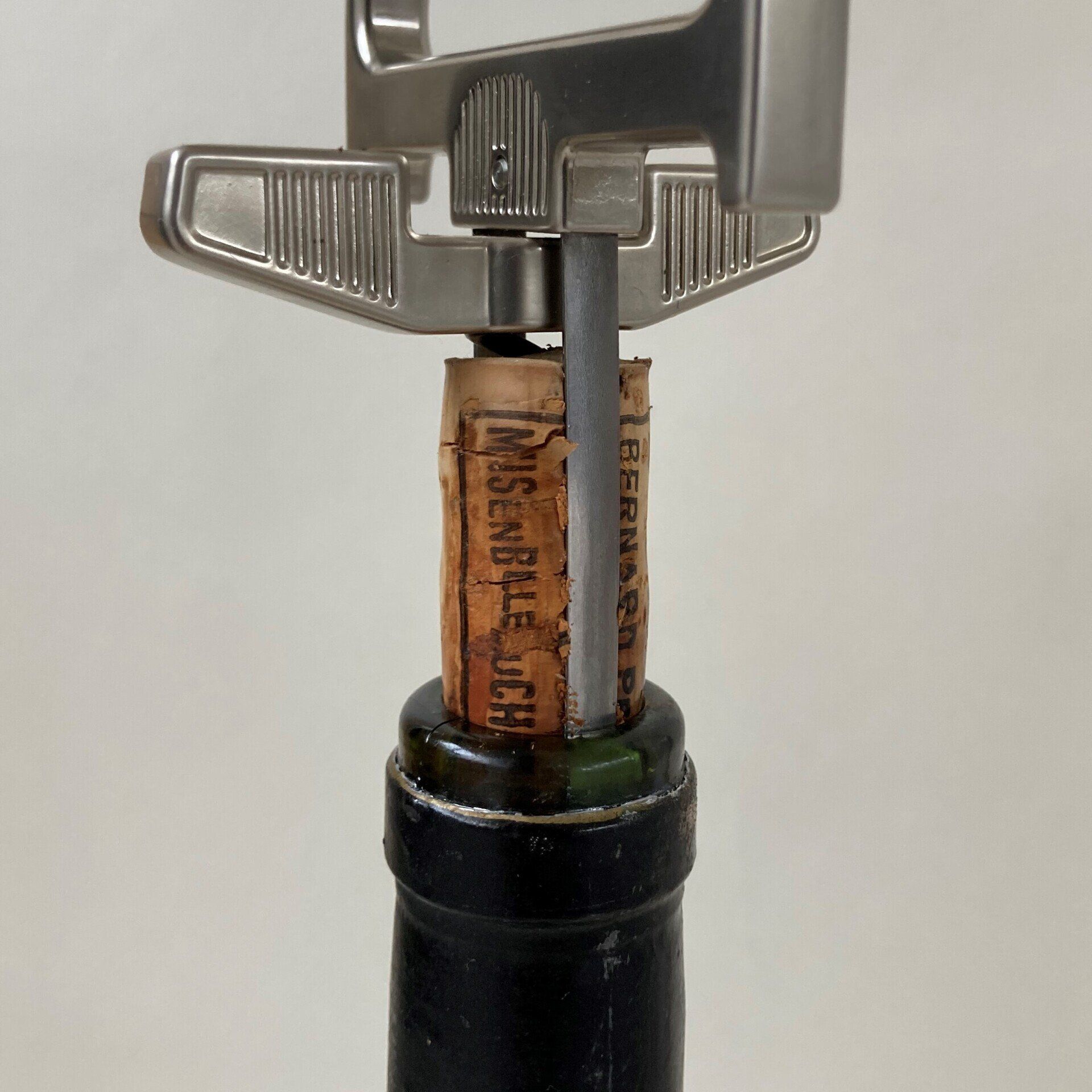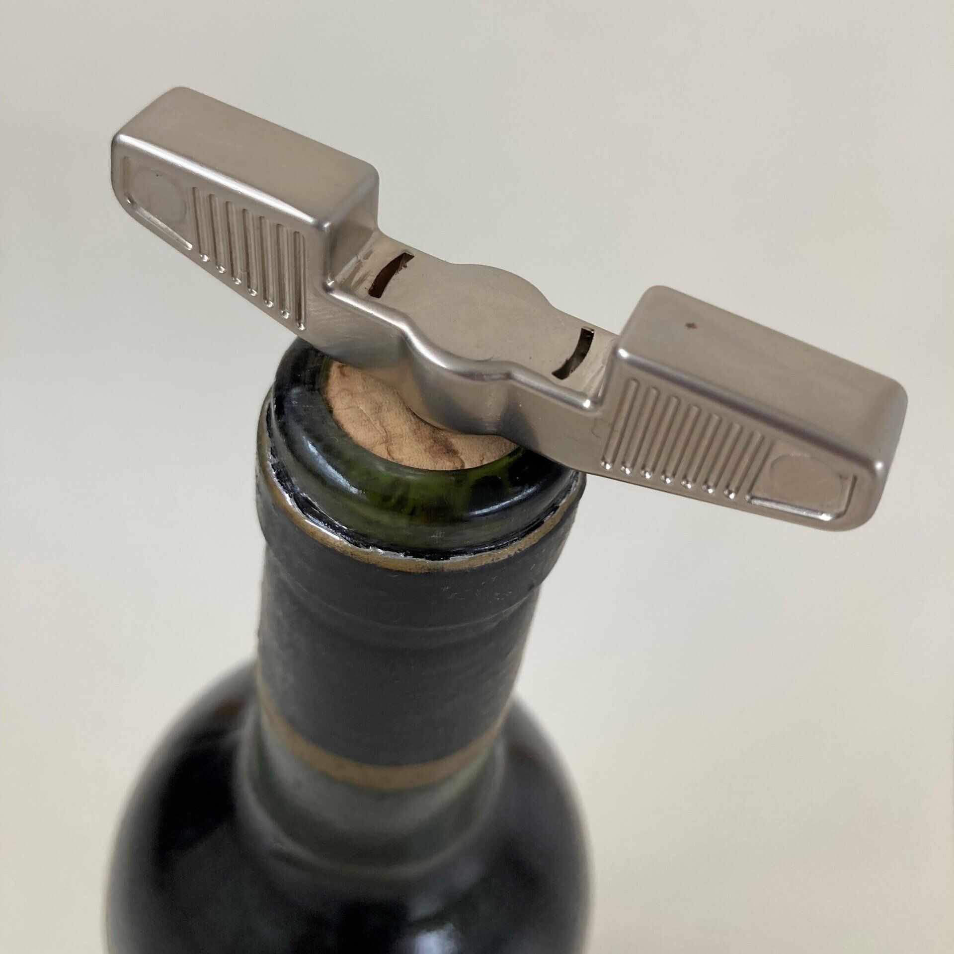 - Er zijn ook speciale openers verkrijgbaar voor oudere kurken, deze werken met 2 scherpe metalen pennen aan de zijkanten van de kurk waarmee de kurk extra wordt ingeklemd.
